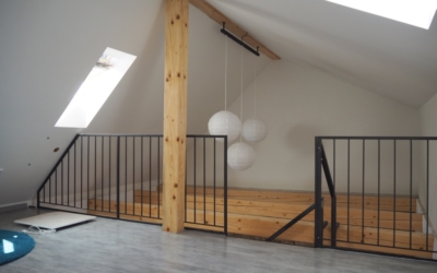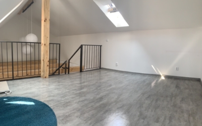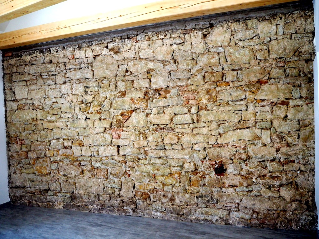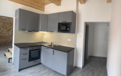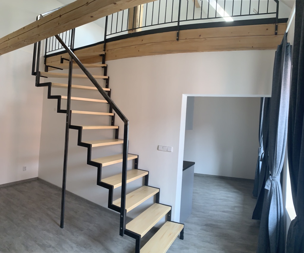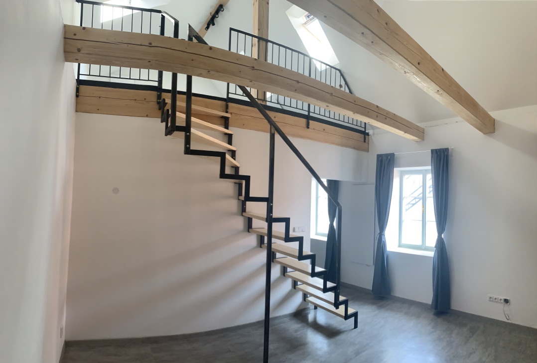 Dispozice: vstupní chodba, kuchyně na kterou navazuje obývací pokoj s původní kamennou stěnou. Z obývací části vede schodiště do patra, kde je prostor ložnice. Prostor bytu je propojený, vzdušný, otevřený. Z podkroví je krásně vidět kostel sv. Václava na jednu stranu a Mariánský kostel na stranu druhou. Topení infrapanely. V patře příprava na mobilní klimatizaci.